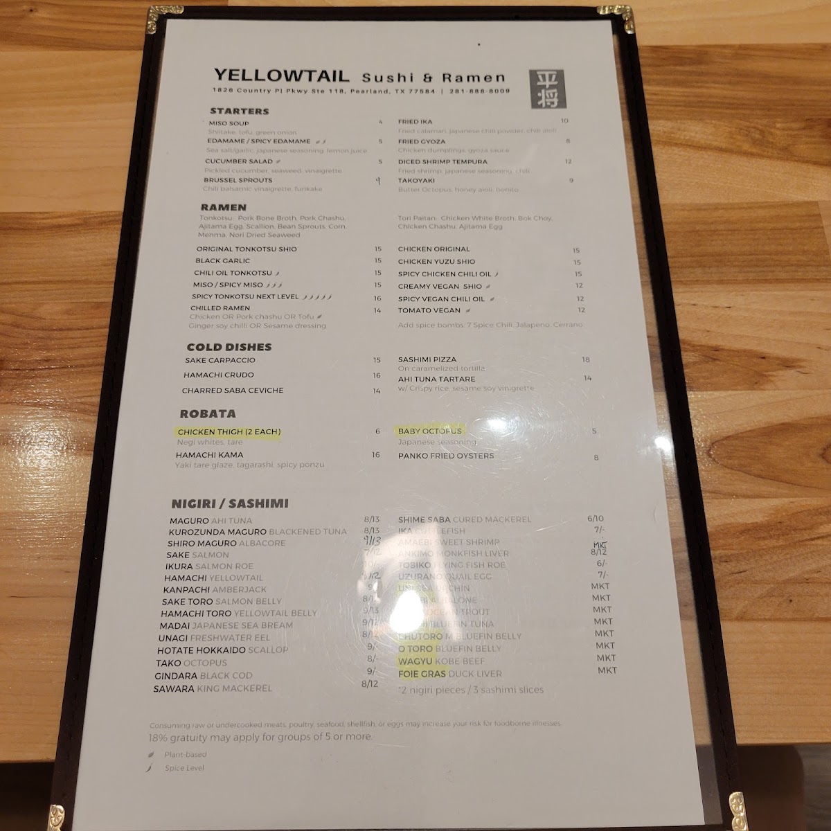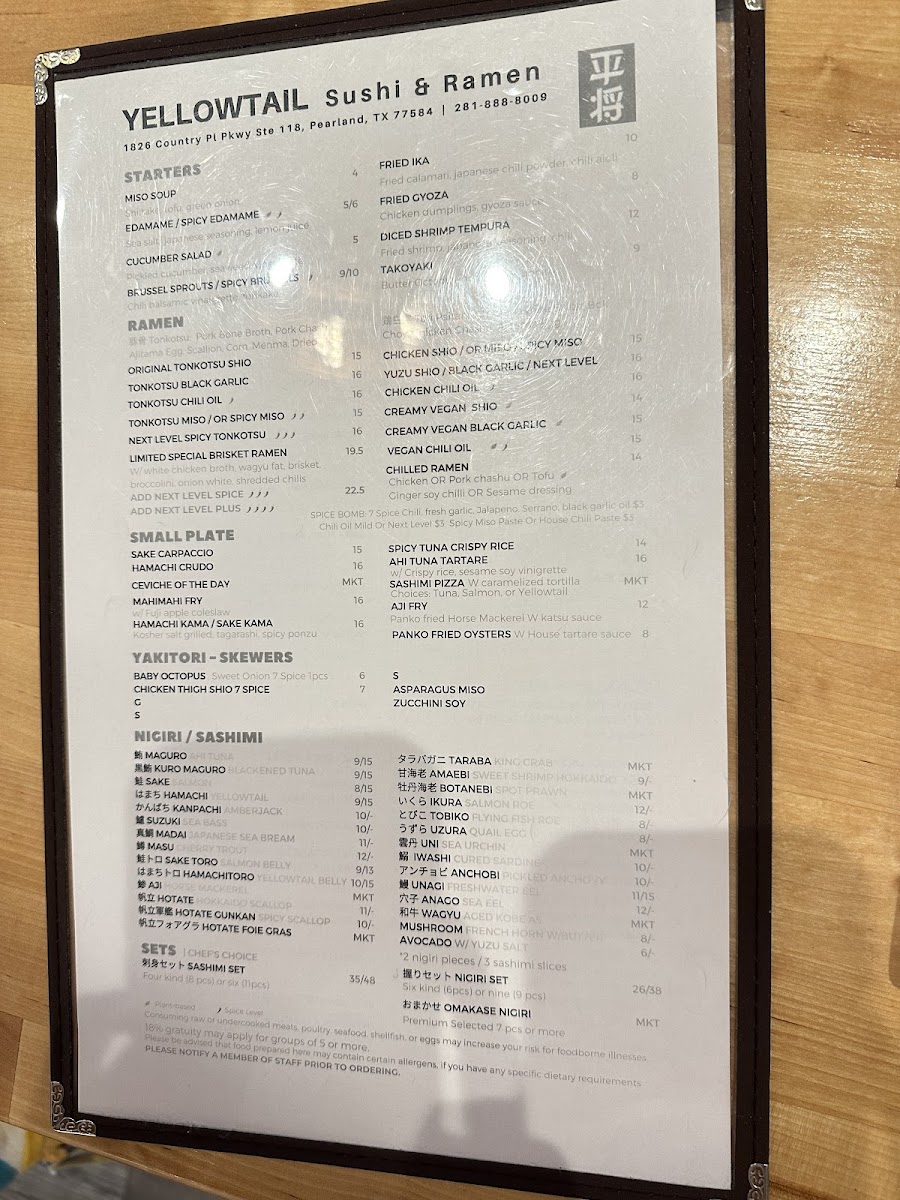 Welcome to Yellowtail, a true gem nestled in Pearland, TX, where the cozy atmosphere and attentive service set the stage for an unforgettable dining experience. As you step inside, the charming decor and tantalizing aroma of authentic Japanese cuisine greet you, promising an adventure for your palate. The menu features an array of classic dishes that capture the essence of Japan, including thick-cut sashimi, rich tonkotsu ramen, and diverse sushi rolls like the Tiger's Eye and Snow Crab.